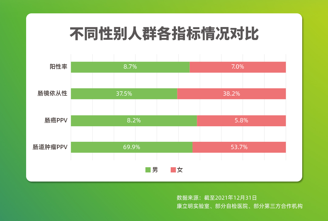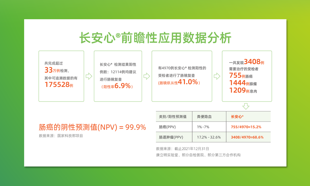 截至2021年12月,作為持續(xù)披露真實世界應(yīng)用數(shù)據(jù)的腸癌糞便基因檢測產(chǎn)品,長安心®共完成33萬例前瞻性應(yīng)用檢測,其中175528例應(yīng)用數(shù)據(jù)可追溯,12114例受檢者長安心®檢測結(jié)果陽性(陽性率6.9%),其中4970例長安心®檢測結(jié)果陽性的受檢者進行了腸鏡復(fù)查(腸鏡依從性41.0%),一共發(fā)現(xiàn)3408例需要治療的受檢者,其中755例腸癌,1444例腺瘤,1209例息肉。長安心®對腸道腫瘤的預(yù)測值(PPV)為68.6%(其中腸癌的陽性預(yù)測值為15.2%),來自國家科技部項目的數(shù)據(jù)顯示,長安心®的陰性預(yù)測值更是高達99.9%。