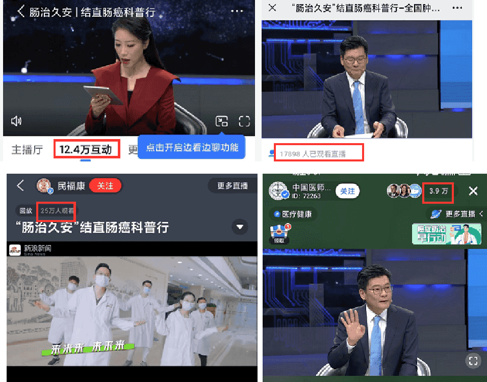 截至2022年4月21日晚,“腸治久安”415全國(guó)腫瘤防治宣傳周在人民日?qǐng)?bào)健康客戶(hù)端、光明日?qǐng)?bào)、南方日?qǐng)?bào)等平臺(tái)刊發(fā)稿件約50篇次,科普直播7場(chǎng),包括騰訊新聞、知乎、民??敌吕似脚_(tái)、名醫(yī)在線(xiàn)各媒體號(hào)及各大合作商的直播平臺(tái)近20家,累計(jì)觀看量近252萬(wàn)人次。