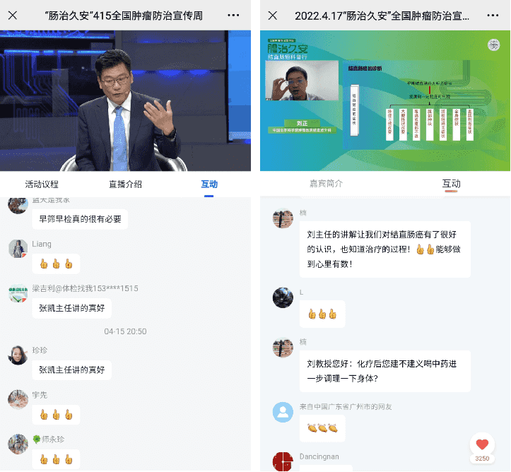 本次全國(guó)腫瘤防治宣傳周吸引了結(jié)直腸領(lǐng)域超38名各級(jí)專(zhuān)家大咖積極參與。其中,由中國(guó)醫(yī)師協(xié)會(huì)主辦,康立明生物協(xié)辦的“腸治久安”415全國(guó)腫瘤防治宣傳周活動(dòng)共舉辦線(xiàn)上直播7場(chǎng),邀請(qǐng)中國(guó)醫(yī)學(xué)科學(xué)院腫瘤醫(yī)院王錫山教授、張凱教授,首都醫(yī)科大學(xué)附屬北京友誼醫(yī)院冀明教授等共9位專(zhuān)家大咖參與現(xiàn)場(chǎng)訪談與科普;聯(lián)合5位結(jié)直腸領(lǐng)域?qū)<覅⑴c“腸治久安”宣傳周專(zhuān)家視頻錄制?!耙癖pB(yǎng)愛(ài)車(chē)一樣愛(ài)惜自己的身體”、“發(fā)現(xiàn)癌癥不光榮,發(fā)現(xiàn)早期癌癥才光榮”等金句也隨著科普直播的擴(kuò)散為大眾所熟知。