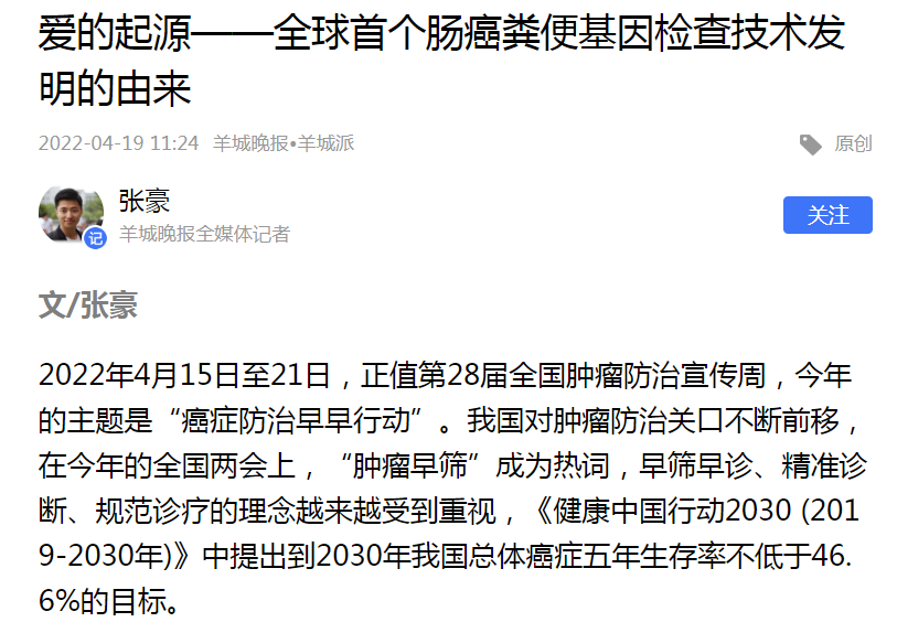 全國(guó)腫瘤防治宣傳周期間羊城晚報(bào)客戶(hù)端汪建平教授專(zhuān)家訪談、“愛(ài)的起源”腸癌早篩技術(shù)發(fā)明由來(lái)等媒體報(bào)道,更是聚焦醫(yī)學(xué)人文領(lǐng)域,通過(guò)表現(xiàn)科研人員在攻克結(jié)直腸癌防治難題的歷程,側(cè)面?zhèn)鞑ソY(jié)直腸癌早篩知識(shí),讓人們認(rèn)識(shí)到新型腸癌早篩技術(shù)研發(fā)的不易,進(jìn)一步提升民眾的自身腸癌防治科學(xué)素養(yǎng)。