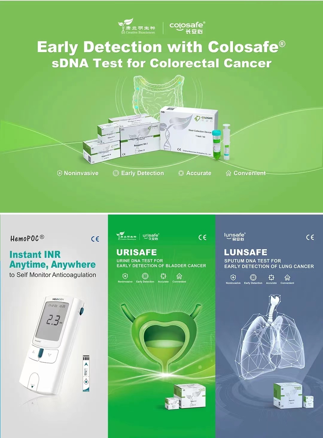 本次盛會(huì),康立明生物攜長(zhǎng)安心®糞便DNA腸癌檢測(cè)、久安心®膀胱癌基因檢測(cè)、會(huì)安心®肺癌基因檢測(cè)、全自動(dòng)樣本預(yù)處理儀以及康立明全資子公司好芝生物產(chǎn)品HelixPOC®全自動(dòng)微流控?zé)晒?/span>PCR一體機(jī)、HemoPOC®凝血檢測(cè)系統(tǒng)赴展。