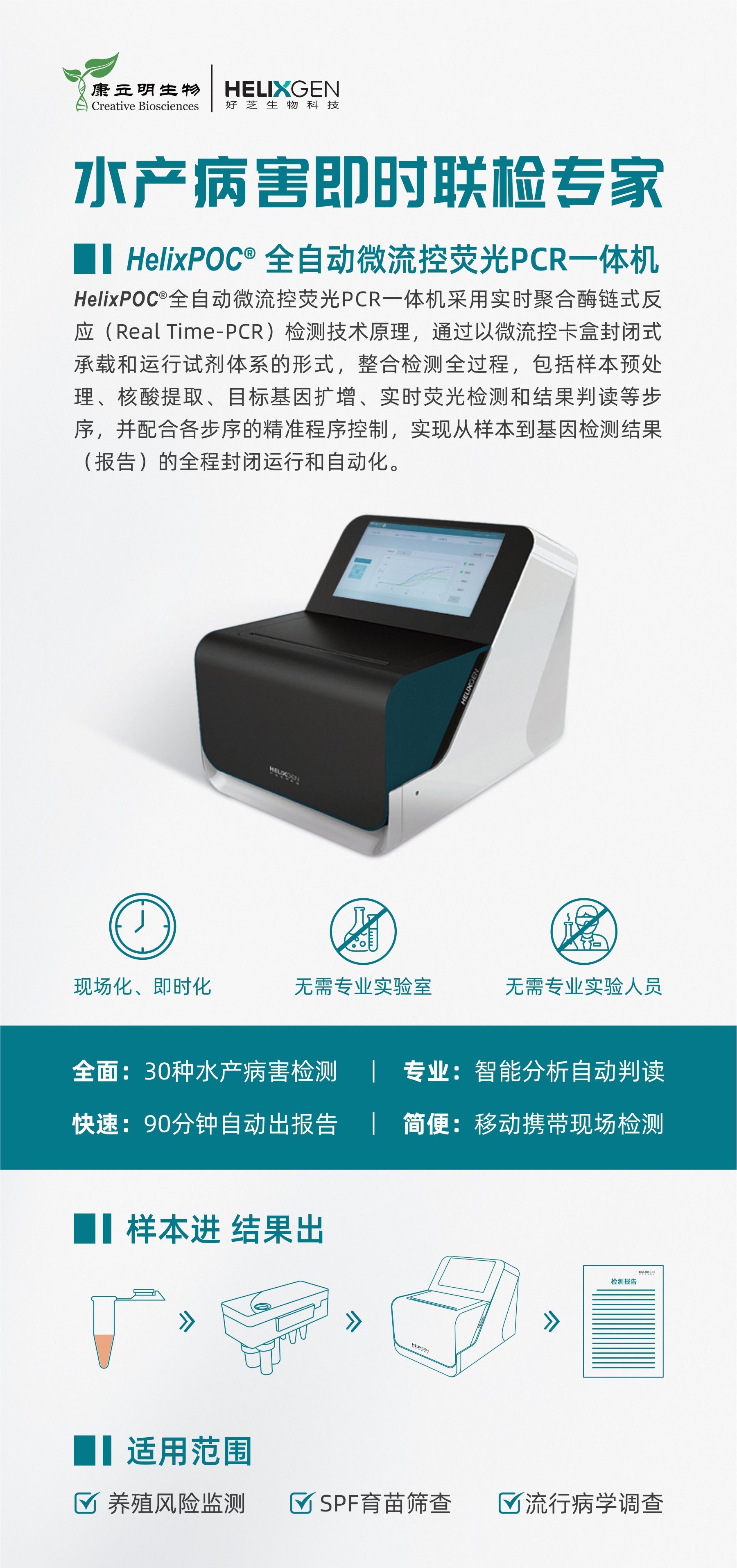 HelixPOC®全自動(dòng)微流控?zé)晒?/span>PCR一體機(jī)采用實(shí)時(shí)聚合酶鏈?zhǔn)椒磻?yīng)(RealTime-PCR)檢測(cè)技術(shù)原理,通過(guò)以微流控卡盒封閉式承載和運(yùn)行試劑體系的形式,整合檢測(cè)全過(guò)程,包括樣本預(yù)處理、核酸提取、目標(biāo)基因擴(kuò)增、實(shí)時(shí)熒光檢測(cè)和結(jié)果判讀等步序,并配合各步序的精準(zhǔn)程序控制,實(shí)現(xiàn)從樣本到基因檢測(cè)結(jié)果(報(bào)告)的全程封閉運(yùn)行和自動(dòng)化。