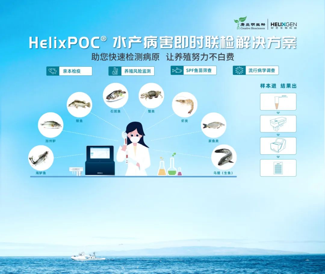 好芝生物以水產(chǎn)養(yǎng)殖病害防治為切入點(diǎn),以養(yǎng)殖物種為檢測(cè)服務(wù)單元,提出水產(chǎn)病害即時(shí)聯(lián)檢解決方案。產(chǎn)品基于HelixPOC®全自動(dòng)微流控核酸檢測(cè)一體機(jī)、水產(chǎn)病害核酸檢測(cè)試劑盒,針對(duì)水產(chǎn)不同細(xì)分種類的病害,實(shí)現(xiàn)樣本進(jìn)、結(jié)果出的全自動(dòng)化流程,無(wú)需專業(yè)操作人員及實(shí)驗(yàn)室,滿足現(xiàn)場(chǎng)快速需求,面向規(guī)?;?、集約化的水產(chǎn)養(yǎng)殖基地、種苗基地、水產(chǎn)檢測(cè)中心等場(chǎng)景。檢測(cè)水產(chǎn)養(yǎng)殖物種涵蓋南美白對(duì)蝦、羅氏沼蝦、克氏原螯蝦、小龍蝦、青蟹、鱖魚、加州鱸、海鱸魚、石斑魚、金鯧魚、草魚、烏鱧、鯽魚等 。